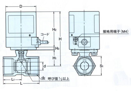 ●材質…バルブボディ:ステンレス(SCS14A)、ステム:SUS316(Crめっき)、ボール:SUS316、インサート:SUS316、ボールシート:PTFE、Oリング:FKM ●最高使用圧力…0.98MPa ●使用流体…空気・水・油 ●電源…AC100V(50/60Hz) ●定格電流…90mA ●最大消費電力…9W ●最大出力トルク…3.9N・m ●定格時間…連続 ●絶縁等級…E種 ●マイクロスイッチ接点容量…AC125V 2A(抵抗負荷)、AC250V 0.6A(抵抗負荷) ●位置リミットスイッチ…開、閉各1個(有電圧) ●絶縁耐圧…AC1500V(1分間)又は(AC1800V 1秒間) ●使用環境…屋外使用可(直射日光不可) ●周囲温度…−20℃〜+50℃ ●取付姿勢…直立〜水平 ●電源コード・接続方式…ビニルキャブタイヤコード・5芯・長さ700mm・0.3mm2 ●潤滑方式…グリース ●過負荷保護装置…インピーダンスプロテクト ●塗装…ハウジング:黒色、カバー:ライトブルーハンマートーン ●機能…90°正逆回転 ●防水構造…IEC529のIP56相当 ●ねじサイズ(PT)…1” ●開閉時間…50Hz:約12秒、60Hz:約10秒 ●サイズ(mm)…d(ボア径):16、d2:Rc1、H:108、H1:32、L:71、L1:36、S1:38、H2:70、H3:5、D:60 ●重量…0.857kg ●ボディが一体造形されたステンレス鋼製 (メーカー) 株式会社エスコ (ブランド) エスコ商品名: Rc1''電動式ボールバルブ(AC100V/ステンレス)カテゴリー: 水まわり・建築金物 > 止水栓・バルブ > バルブ > ボールバルブ