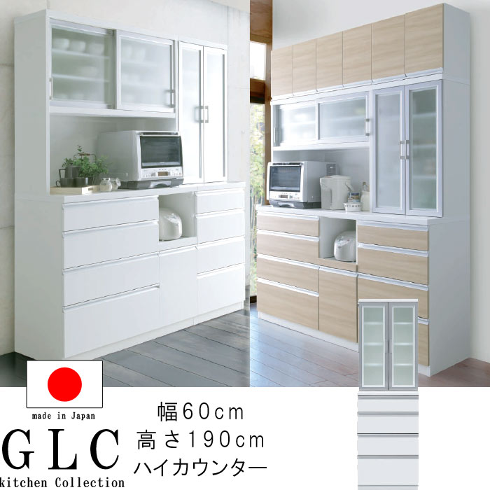 国産 食器棚 幅60cm 高さ190cm ハイカウンター ガラス引戸 4段引出し キッチンボード ダイニングボード ホワイト WH ナチュラル NA キッチン収納 送料無料