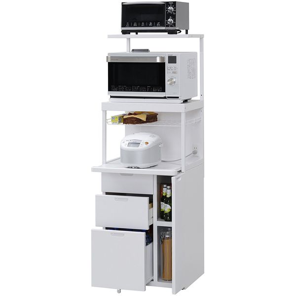 ■サイズ:幅56.5×奥行き50×高さ166cm ■重量:24kg ■素材・材料:本体:鋼板(樹脂焼付塗装) 扉・引き出し前面板:ポリスチレン 扉:鋼板 天板・スライドテーブル:着色亜鉛鋼板 上棚板:鋼板(樹脂焼付塗装) 上支柱:鋼管(樹脂焼付塗装) ■付属品や、仕様など【2口コンセント付】 ・2口で合計1500W ●収納力抜群の家電ラック。