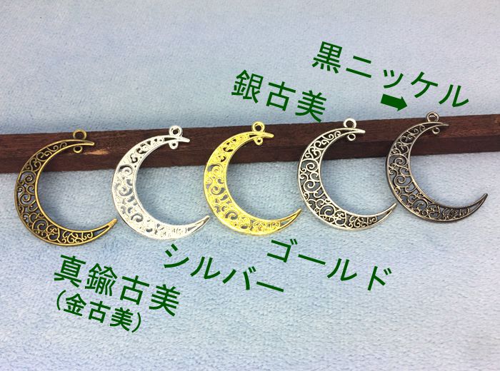 3243★ 金属チャーム 三日月 透かし B 40*30mm 厚1.5mm 5個入り アンティークゴールド(真鍮古美) シルバー ゴールド 銀古美 黒ニッケル マットゴールド 弧形 月 二つカン