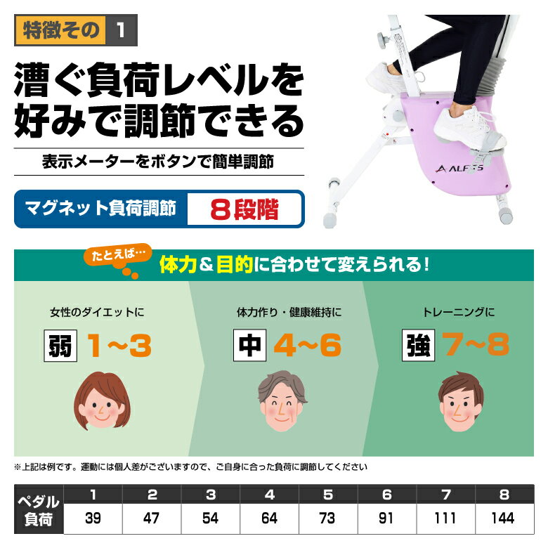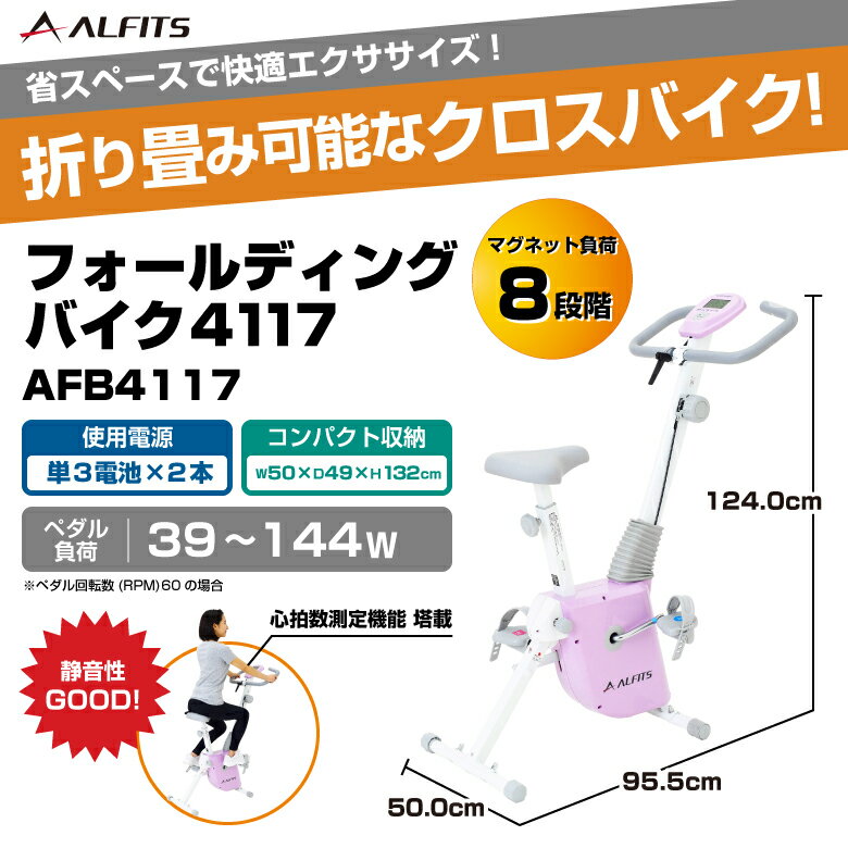 製品名 フォールディングバイク4117 型番 AFB4117 製品サイズ W500 × D955 × H1,240mm(折畳サイズ:W500 × D490 × H1,320mm) 梱包サイズ W470 × D255 × H770mm 重量 ■本体:約21.5kg■梱包:約23.5kg 材質 スチール/ABS/PVC/PU/PP 使用制限体重 90kg 連続使用時間 30分 JAN 4969182513127 メーカー保証 ご購入日より1年間 商品説明 ■ペダル負荷8段階(手動マグネット負荷方式)■パルスセンサー:グリップセンサー方式■オートスタート&オフ機能■心拍数測定可能■体力評価機能搭載■サドル高さ調節可能■ペダルバンド付き■電源:単3乾電池×2本■折り畳み収納可能■ハンドル角度調節 広告文責 アルインコ株式会社TEL:06-7636-2351 メーカー(製造)・輸入者名 アルインコ株式会社 区分 健康器具 生産国 中国1日の使用は30分までですか? 連続使用時間は30分までとなっておりますが、約1時間程度機械を休めていただければ再度ご利用いただく事は可能です。